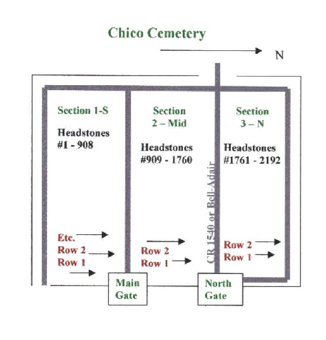 The Cemetery 'Layout Order' follows below this map. Use this listing to find headstones, or to determine relationships.
