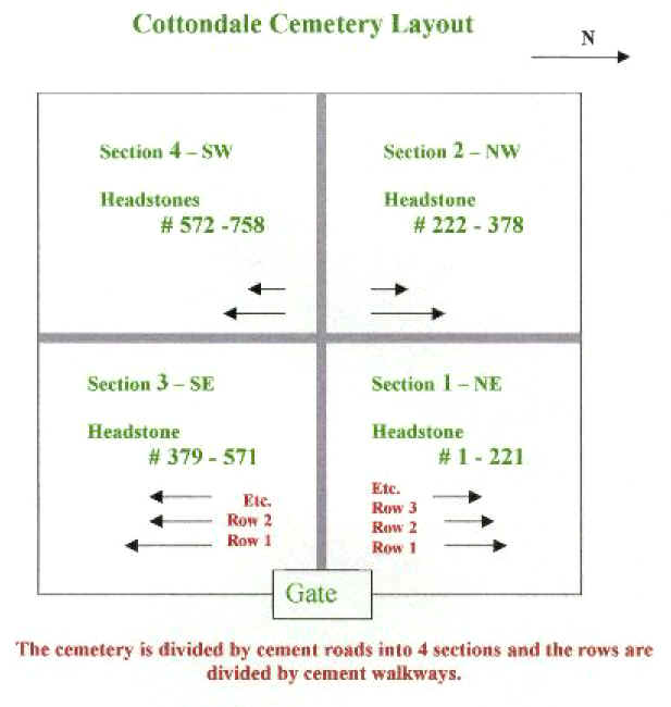 The Cemetery 'Layout Order' follows below this map. Use this listing to find headstones, or to determine relationships.