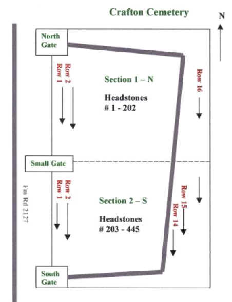 Crafton Cemetery is in the northwest part of Wise County to the north of the town of Crafton. Go west on 1810 from Chico and then turn north on Fm Rd 2127. The cemetery is on the right side of the road just past Crafton. There's a gate on the north and south corners of the cemetery.