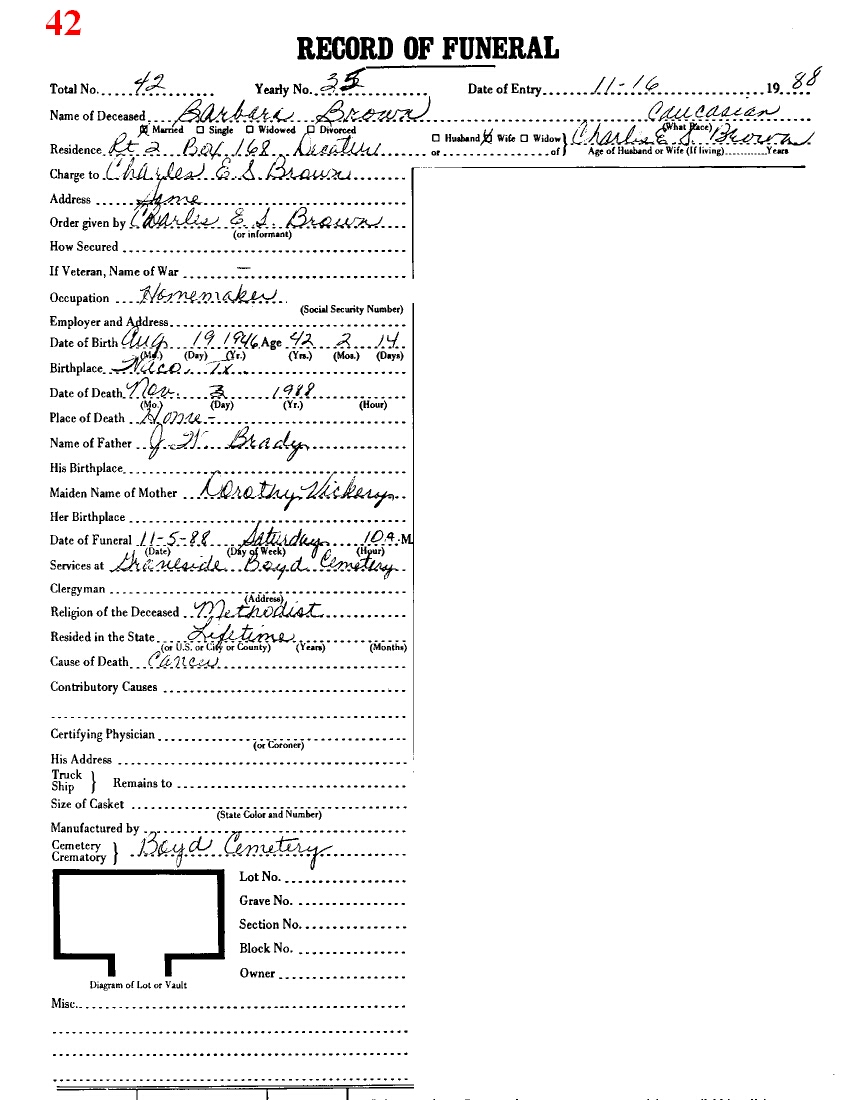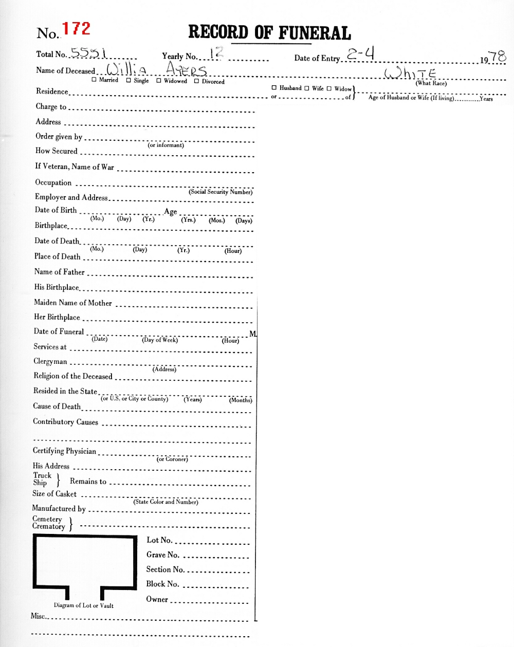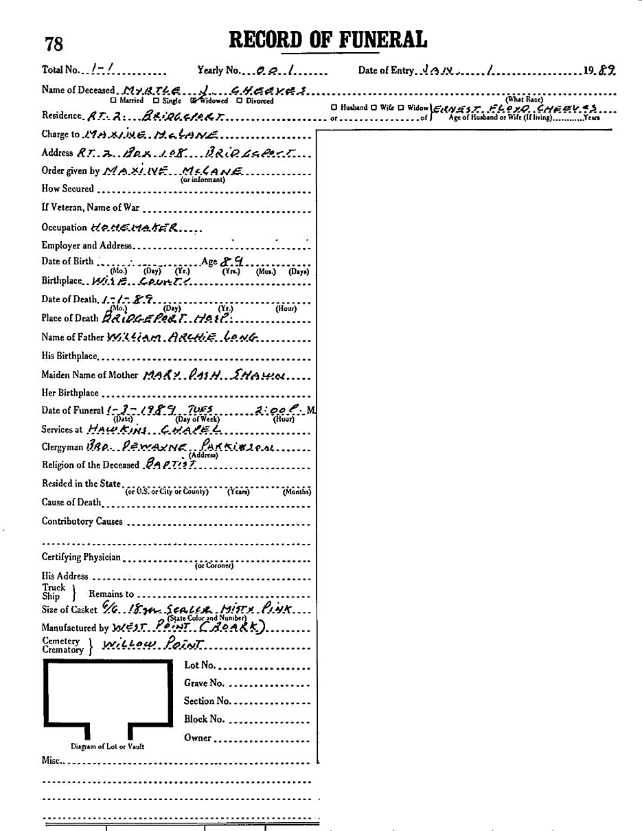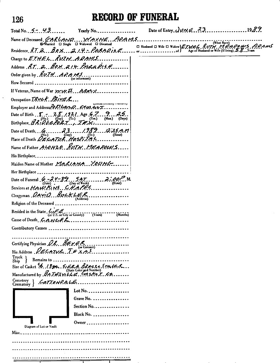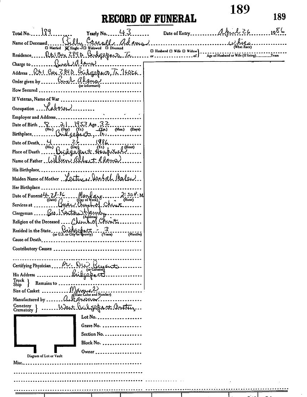A boy from AR, Killed on railroad Christian Funeral Home C22/C22-254.jpg Aaron, James Thomas Christian Funeral Home C31/C31-110.jpg Abbott, Julia Gage Christian Funeral Home C31/C31-123.jpg Abbott, Lewis Elmer Coker Funeral Home C56/C56-091.jpg Abbott, T. Aleck Christian Funeral Home C35/C35-273.jpg Abbs, James Russell Christian Funeral Home C01/C01-110.jpg Abel, Anto A., Boyd Funeral Home B88/B88-135.jpg Abel, Arlyce Astor, Boyd Funeral File Sheet BF81/BF81-141.jpg Abel, Evelyn Myra Muse, Boyd Funeral File Sheet BF95/BF95-001.jpg Abel, Helen Elizabeth Miller, Boyd Funeral File Sheet BF91/BF91-006.jpg Abel, Helen Miller, Boyd Funeral Home B88/B88-125.jpg Abel, Nancy Jean Prince Coker Funeral Home C64/C64-076.jpg Abel, Walter V. Christian Funeral Home C22/C22-162.jpg Abernathy , Mary Ruth Cook Christian Funeral Home C86/C86-137.jpg Abernathy, Baby of Bill & Edna Earl, Hawkins Funeral Home H63/H63-110.jpg Abernathy, Ella Dora Jackson Christian Funeral Home C39/C39-261.jpg Abernathy, L.D., Mr. Christian Funeral Home C22/C22-269.jpg Abernathy, William Glenn, Hawkins Funeral File Sheet HF87/HF87-107.jpg Abernathy, William Glenn, Hawkins Funeral Home H84/H84-282.jpg Able, Barbara Elizabeth "Betty" Morris Coker Funeral Home C64/C64-215.jpg Able, Carrol Floyd "Crick", Hawkins Funeral File Sheet HF00/HF00-001.jpg Able, Forest Lee Christian Funeral Home C50/C50-017.jpg Able, Thomas Franklin Coker Funeral Home C56/C56-148.jpg Able, William Morgan Coker Funeral Home C56/C56-264a.jpg Able, William Morgan Coker Funeral Home C56/C56-264.jpg Absher, Donald Marion Christian Funeral Home C01/C01-182.jpg Absher, Opal Lee Kaker Hunter, Hawkins Funeral File Sheet HF01/HF01-001.jpg Absher, Ulyses Sherman Christian Funeral Home C31/C31-201.jpg Absher, William P. "Bill", Hawkins Funeral File Sheet HF93/HF93-001.jpg Absher, William P., Hawkins Funeral Home H93/H93-088.jpg Acker, Mary Elizabeth Christian Funeral Home C15/C15-102.jpg Acker, William H., Dr. Christian Funeral Home C22/C22-084.jpg Acola, Marian Elizabeth Woody Christian Funeral Home C98/C98-299.jpg Acola, Sam Christian Funeral Home C80/C80-104.jpg Acola, Sam, Hawkins/Christian Funeral Home HCD80/HCD80-003.jpg Action, Bonnie Lynn Bowser, Hawkins Funeral File Sheet HF73/HF73-0001.jpg Acton, Bonnie Lynn Bauser, Hawkins Funeral Home H80/H80-028.jpg Adair, Betty Darline Christian Funeral Home C45/C45-102.jpg Adair, Carl Sine Christian Funeral Home C45/C45-102.jpg Adair, Ester, Hawkins Funeral File Sheet HF73/HF73-0002.jpg Adama, Randy Dale, Jr., Hawkins Funeral Home H90/H90-110.jpg Adams, Acie Dee Christian Funeral Home C76/C76-098.jpg Adams, Alonzo Bright, Hawkins Funeral Home H61/H61-044.jpg Adams, Audrey, Boyd Funeral Home B88/B88-165.jpg Adams, Barry Carroll, Hawkins Funeral File Sheet HF85/HF85-043.jpg Adams, Beulah Etta Pitts, Hawkins Funeral File Sheet HF73/HF73-0004.jpg Adams, Billy Carroll, Hawkins Funeral Home H84/H84-189.jpg Adams, Carl Victor, Hawkins Funeral Home H68/H68-061.jpg Adams, Ceffie Daisy Craighead Christian Funeral Home C45/C45-155.jpg Adams, Charles Norris, Boyd Funeral File Sheet BF98/BF98-064.jpg Adams, Charlie Bruce Christian Funeral Home C59/C59-090.jpg Adams, Corinne P. Peterson Christian Funeral Home C01/C01-193.jpg Adams, Danny Charles, Boyd Funeral File Sheet BF95/BF95-135.jpg Adams, Dewey Avon, Hawkins Funeral File Sheet HF73/HF73-0003.jpg Adams, Edgar Ross, Hawkins Funeral Home H57/H57-039.jpg Adams, Elmer Justice, Hawkins Funeral Home H66/H66-210.jpg Adams, Eula C. Ingle, Hawkins Funeral Home H69/H69-131.jpg Adams, Garland Wayne, Hawkins Funeral File Sheet HF89/HF89-002.jpg Adams, Garland Wayne, Hawkins Funeral Home H88/H88-126.jpg Adams, George Martain Christian Funeral Home C49/C49-028.jpg Adams, Jerry Dean Christian Funeral Home C73/C73-206.jpg Adams, John Christian Funeral Home C35/C35-289.jpg Adams, John Henry, Hawkins Funeral File Sheet HF01/HF01-002.jpg Adams, John Louis, Hawkins Funeral Home H55/H55-147.jpg Adams, Josie Jones Churchhill Christian Funeral Home C91/C91-116.jpg Adams, Kenney Milton "Ragmop", Boyd Funeral File Sheet BF81/BF81-015.jpg Adams, Laura Sue Coker Funeral Home C27/C27-008.jpg Adams, Leatrice Isabell Moler, Hawkins Funeral File Sheet HF99/HF99-001.jpg Adams, Lera "Gerry" Burnette Woltz, Hawkins Funeral File Sheet HF98/HF98-001.jpg Adams, Leroy Franklin Christian Funeral Home C93/C93-076.jpg Adams, Lillian Josie Christian Funeral Home C73/C73-167.jpg Adams, Margaret Alma Murphy Christian Funeral Home C68/C68-465.jpg Adams, Margaret Iola Parish Christian Funeral Home C95/C95-146.jpg Adams, Marina Helen Young, Hawkins Funeral Home H69/H69-005.jpg Adams, Martha Ann Malone Christian Funeral Home C42/C42-076.jpg Adams, Mary Elizabeth "Betty"(Karen), Hawkins Funeral Home H53/H53-107.jpg Adams, Mary Ferguson Dill, Hawkins Funeral Home H60/H60-031.jpg Adams, Milton Elmore Christian Funeral Home C39/C39-106.jpg Adams, Myrtle Floyd Harris, Hawkins Funeral File Sheet HF01/HF01-003.jpg Adams, Newell Wayne "Bill" Dec 10, 1980 Mrs. Adams Pleasant Grove #1 CL80/CL80-38 Adams, Oma Nov 23, 1981 Bud Adams & Jessie Ragsdale Sweetwater CL80/CL80-107 Adams, Randy Dale, Jr., Hawkins Funeral File Sheet HF91/HF91-001.jpg Adams, Robert Esco, Hawkins Funeral File Sheet HF73/HF73-0005.jpg Adams, Robert Louis, Hawkins Funeral Home H57/H57-171.jpg Adams, Ronald Floyd Christian Funeral Home C89/C89-163.jpg Adams, Sarah F. Christian Funeral Home C45/C45-259.jpg Adams, W., Hawkins Funeral Home H23/H23-148.jpg Adams, William Rosco "Bud" Christian Funeral Home C88/C88-185.jpg Adams, William Walter, Hawkins Funeral Home H61/H61-145.jpg Addington, Jimmy Ray Christian Funeral Home C88/C88-260.jpg Adkins, Lonnie Roe Christian Funeral Home C93/C93-012.jpg Adkins, Paul William, Hawkins Funeral Home H33/H33-091.jpg Adkins, Peggy Mildred Thomas Christian Funeral Home C86/C86-283.jpg Admire, Clarence Holt, Hawkins Funeral Home H57/H57-114.jpg Admire, Willie Audrey King, Hawkins Funeral Home H55/H55-151.jpg Aerni, Lucile Flowers, Hawki