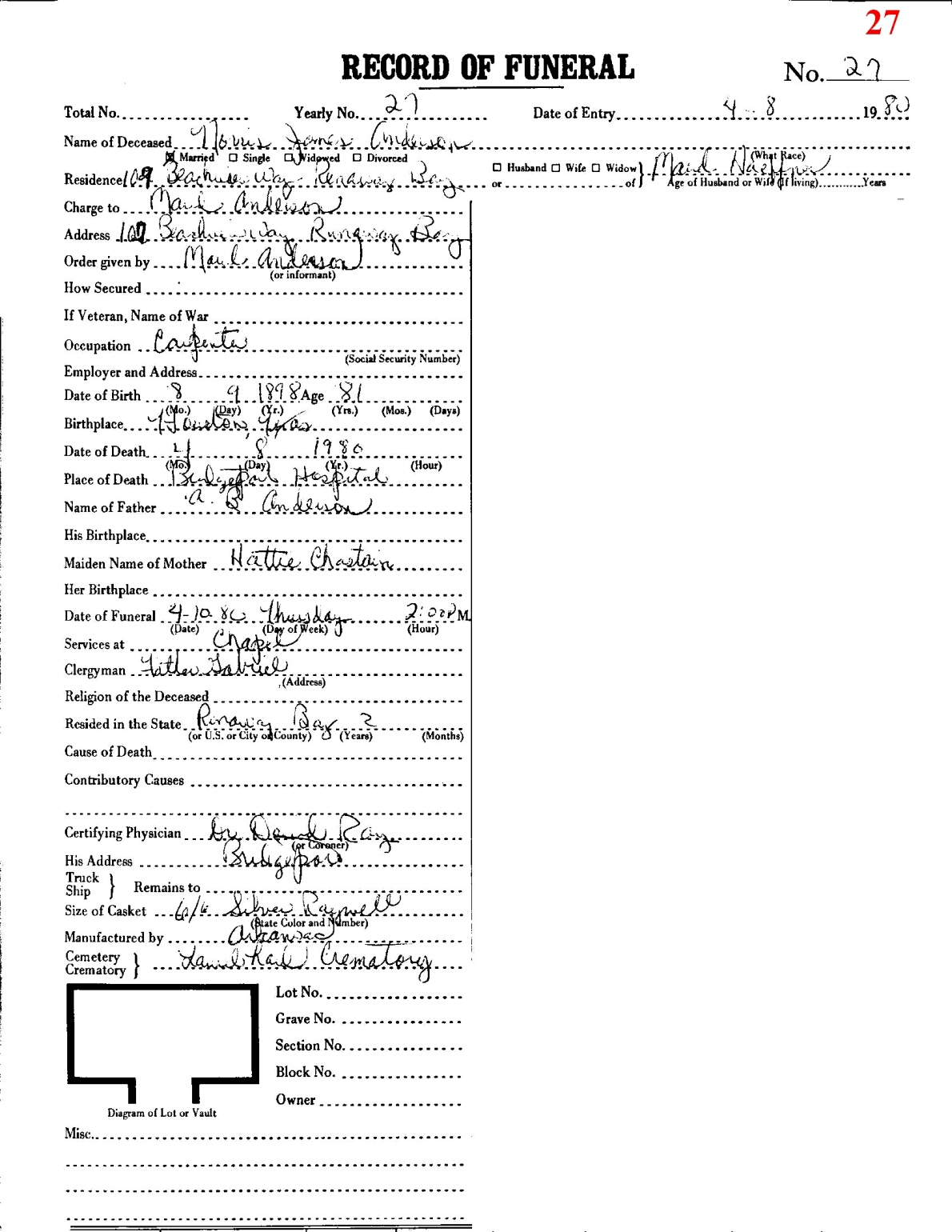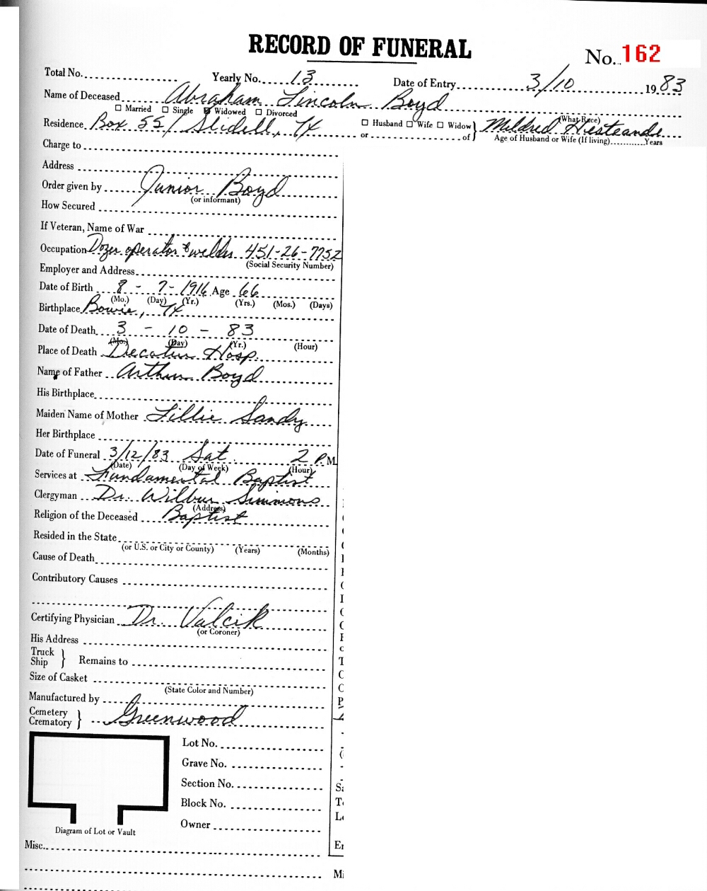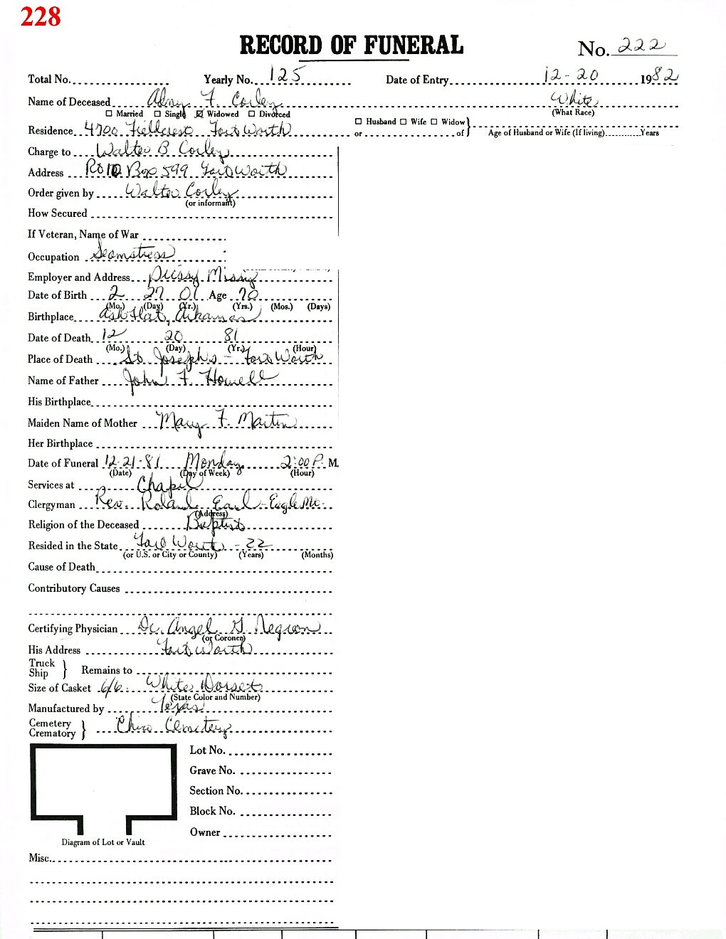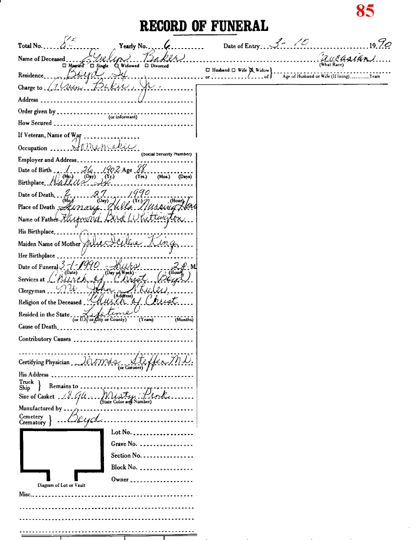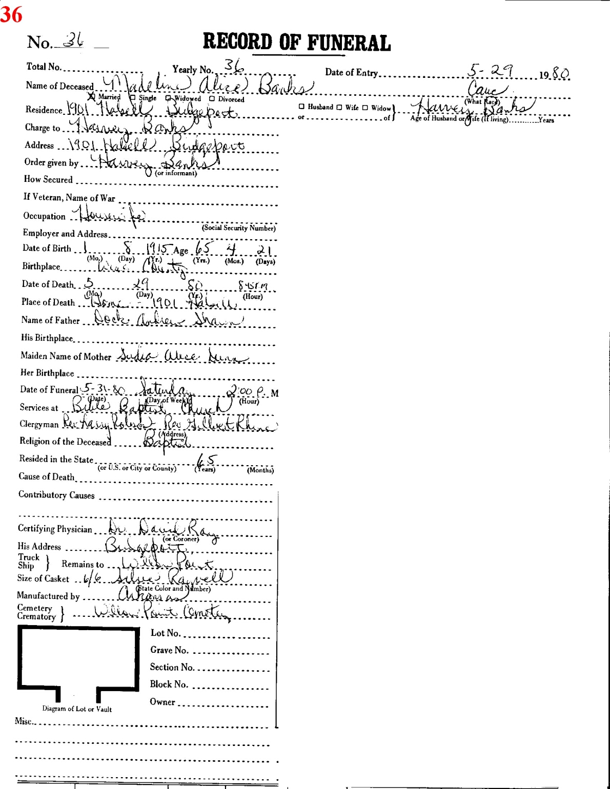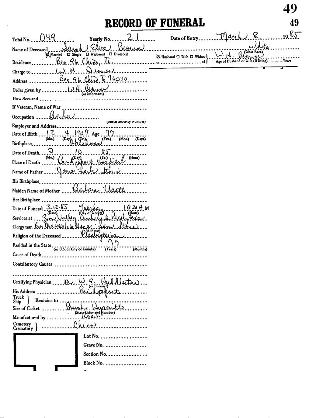A boy from AR, Killed on railroad Christian Funeral Home C22/C22-254.jpg Aaron, James Thomas Christian Funeral Home C31/C31-110.jpg Abbott, Julia Gage Christian Funeral Home C31/C31-123.jpg Abbott, Lewis Elmer Coker Funeral Home C56/C56-091.jpg Abbott, T. Aleck Christian Funeral Home C35/C35-273.jpg Abbs, James Russell Christian Funeral Home C01/C01-110.jpg Abel, Anto A., Boyd Funeral Home B88/B88-135.jpg Abel, Arlyce Astor, Boyd Funeral File Sheet BF81/BF81-141.jpg Abel, Evelyn Myra Muse, Boyd Funeral File Sheet BF95/BF95-001.jpg Abel, Helen Elizabeth Miller, Boyd Funeral File Sheet BF91/BF91-006.jpg Abel, Helen Miller, Boyd Funeral Home B88/B88-125.jpg Abel, Nancy Jean Prince Coker Funeral Home C64/C64-076.jpg Abel, Walter V. Christian Funeral Home C22/C22-162.jpg Abernathy , Mary Ruth Cook Christian Funeral Home C86/C86-137.jpg Abernathy, Baby of Bill & Edna Earl, Hawkins Funeral Home H63/H63-110.jpg Abernathy, Ella Dora Jackson Christian Funeral Home C39/C39-261.jpg Abernathy, L.D., Mr. Christian Funeral Home C22/C22-269.jpg Abernathy, William Glenn, Hawkins Funeral File Sheet HF87/HF87-107.jpg Abernathy, William Glenn, Hawkins Funeral Home H84/H84-282.jpg Able, Barbara Elizabeth "Betty" Morris Coker Funeral Home C64/C64-215.jpg Able, Carrol Floyd "Crick", Hawkins Funeral File Sheet HF00/HF00-001.jpg Able, Forest Lee Christian Funeral Home C50/C50-017.jpg Able, Thomas Franklin Coker Funeral Home C56/C56-148.jpg Able, William Morgan Coker Funeral Home C56/C56-264a.jpg Able, William Morgan Coker Funeral Home C56/C56-264.jpg Absher, Donald Marion Christian Funeral Home C01/C01-182.jpg Absher, Opal Lee Kaker Hunter, Hawkins Funeral File Sheet HF01/HF01-001.jpg Absher, Ulyses Sherman Christian Funeral Home C31/C31-201.jpg Absher, William P. "Bill", Hawkins Funeral File Sheet HF93/HF93-001.jpg Absher, William P., Hawkins Funeral Home H93/H93-088.jpg Acker, Mary Elizabeth Christian Funeral Home C15/C15-102.jpg Acker, William H., Dr. Christian Funeral Home C22/C22-084.jpg Acola, Marian Elizabeth Woody Christian Funeral Home C98/C98-299.jpg Acola, Sam Christian Funeral Home C80/C80-104.jpg Acola, Sam, Hawkins/Christian Funeral Home HCD80/HCD80-003.jpg Action, Bonnie Lynn Bowser, Hawkins Funeral File Sheet HF73/HF73-0001.jpg Acton, Bonnie Lynn Bauser, Hawkins Funeral Home H80/H80-028.jpg Adair, Betty Darline Christian Funeral Home C45/C45-102.jpg Adair, Carl Sine Christian Funeral Home C45/C45-102.jpg Adair, Ester, Hawkins Funeral File Sheet HF73/HF73-0002.jpg Adama, Randy Dale, Jr., Hawkins Funeral Home H90/H90-110.jpg Adams, Acie Dee Christian Funeral Home C76/C76-098.jpg Adams, Alonzo Bright, Hawkins Funeral Home H61/H61-044.jpg Adams, Audrey, Boyd Funeral Home B88/B88-165.jpg Adams, Barry Carroll, Hawkins Funeral File Sheet HF85/HF85-043.jpg Adams, Beulah Etta Pitts, Hawkins Funeral File Sheet HF73/HF73-0004.jpg Adams, Billy Carroll, Hawkins Funeral Home H84/H84-189.jpg Adams, Carl Victor, Hawkins Funeral Home H68/H68-061.jpg Adams, Ceffie Daisy Craighead Christian Funeral Home C45/C45-155.jpg Adams, Charles Norris, Boyd Funeral File Sheet BF98/BF98-064.jpg Adams, Charlie Bruce Christian Funeral Home C59/C59-090.jpg Adams, Corinne P. Peterson Christian Funeral Home C01/C01-193.jpg Adams, Danny Charles, Boyd Funeral File Sheet BF95/BF95-135.jpg Adams, Dewey Avon, Hawkins Funeral File Sheet HF73/HF73-0003.jpg Adams, Edgar Ross, Hawkins Funeral Home H57/H57-039.jpg Adams, Elmer Justice, Hawkins Funeral Home H66/H66-210.jpg Adams, Eula C. Ingle, Hawkins Funeral Home H69/H69-131.jpg Adams, Garland Wayne, Hawkins Funeral File Sheet HF89/HF89-002.jpg Adams, Garland Wayne, Hawkins Funeral Home H88/H88-126.jpg Adams, George Martain Christian Funeral Home C49/C49-028.jpg Adams, Jerry Dean Christian Funeral Home C73/C73-206.jpg Adams, John Christian Funeral Home C35/C35-289.jpg Adams, John Henry, Hawkins Funeral File Sheet HF01/HF01-002.jpg Adams, John Louis, Hawkins Funeral Home H55/H55-147.jpg Adams, Josie Jones Churchhill Christian Funeral Home C91/C91-116.jpg Adams, Kenney Milton "Ragmop", Boyd Funeral File Sheet BF81/BF81-015.jpg Adams, Laura Sue Coker Funeral Home C27/C27-008.jpg Adams, Leatrice Isabell Moler, Hawkins Funeral File Sheet HF99/HF99-001.jpg Adams, Lera "Gerry" Burnette Woltz, Hawkins Funeral File Sheet HF98/HF98-001.jpg Adams, Leroy Franklin Christian Funeral Home C93/C93-076.jpg Adams, Lillian Josie Christian Funeral Home C73/C73-167.jpg Adams, Margaret Alma Murphy Christian Funeral Home C68/C68-465.jpg Adams, Margaret Iola Parish Christian Funeral Home C95/C95-146.jpg Adams, Marina Helen Young, Hawkins Funeral Home H69/H69-005.jpg Adams, Martha Ann Malone Christian Funeral Home C42/C42-076.jpg Adams, Mary Elizabeth "Betty"(Karen), Hawkins Funeral Home H53/H53-107.jpg Adams, Mary Ferguson Dill, Hawkins Funeral Home H60/H60-031.jpg Adams, Milton Elmore Christian Funeral Home C39/C39-106.jpg Adams, Myrtle Floyd Harris, Hawkins Funeral File Sheet HF01/HF01-003.jpg Adams, Newell Wayne "Bill" Dec 10, 1980 Mrs. Adams Pleasant Grove #1 CL80/CL80-38 Adams, Oma Nov 23, 1981 Bud Adams & Jessie Ragsdale Sweetwater CL80/CL80-107 Adams, Randy Dale, Jr., Hawkins Funeral File Sheet HF91/HF91-001.jpg Adams, Robert Esco, Hawkins Funeral File Sheet HF73/HF73-0005.jpg Adams, Robert Louis, Hawkins Funeral Home H57/H57-171.jpg Adams, Ronald Floyd Christian Funeral Home C89/C89-163.jpg Adams, Sarah F. Christian Funeral Home C45/C45-259.jpg Adams, W., Hawkins Funeral Home H23/H23-148.jpg Adams, William Rosco "Bud" Christian Funeral Home C88/C88-185.jpg Adams, William Walter, Hawkins Funeral Home H61/H61-145.jpg Addington, Jimmy Ray Christian Funeral Home C88/C88-260.jpg Adkins, Lonnie Roe Christian Funeral Home C93/C93-012.jpg Adkins, Paul William, Hawkins Funeral Home H33/H33-091.jpg Adkins, Peggy Mildred Thomas Christian Funeral Home C86/C86-283.jpg Admire, Clarence Holt, Hawkins Funeral Home H57/H57-114.jpg Admire, Willie Audrey King, Hawkins Funeral Home H55/H55-151.jpg Aerni, Lucile Flowers, Hawki