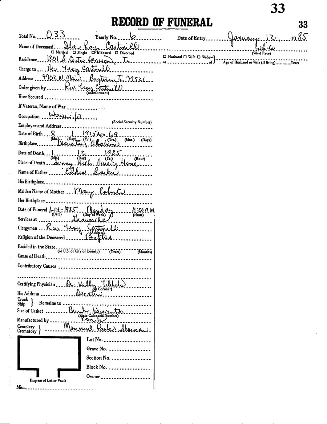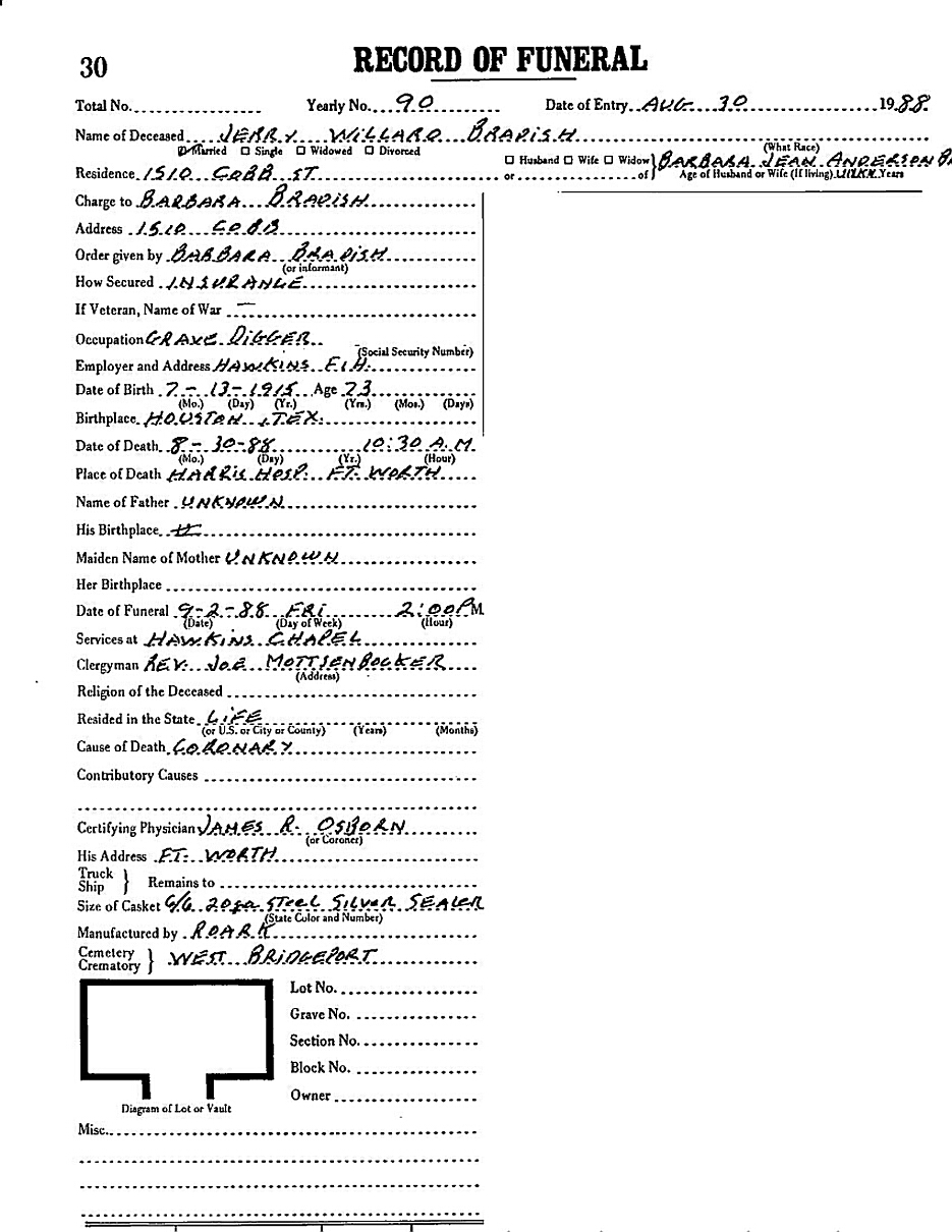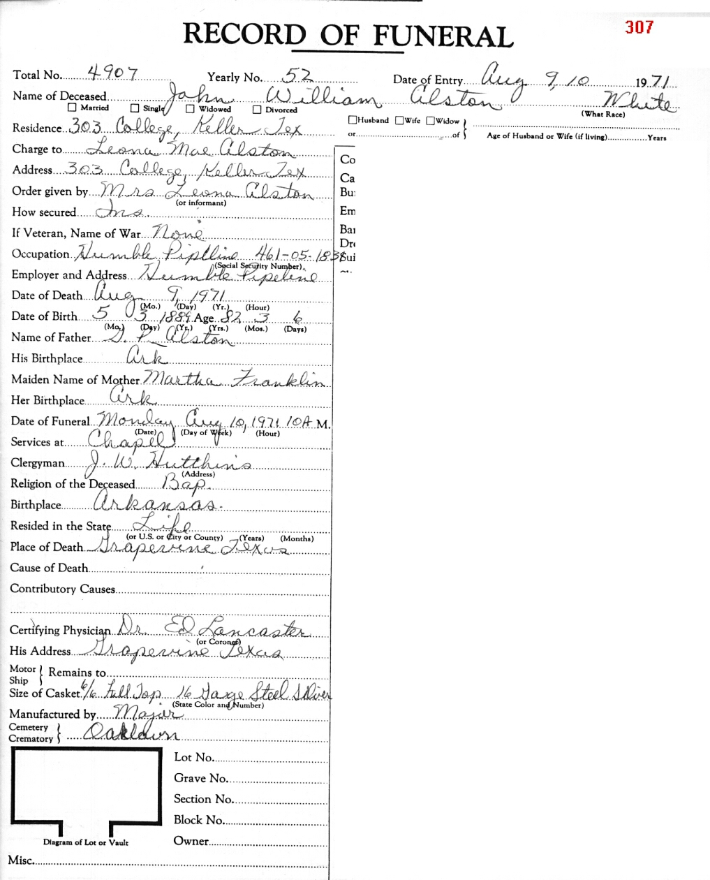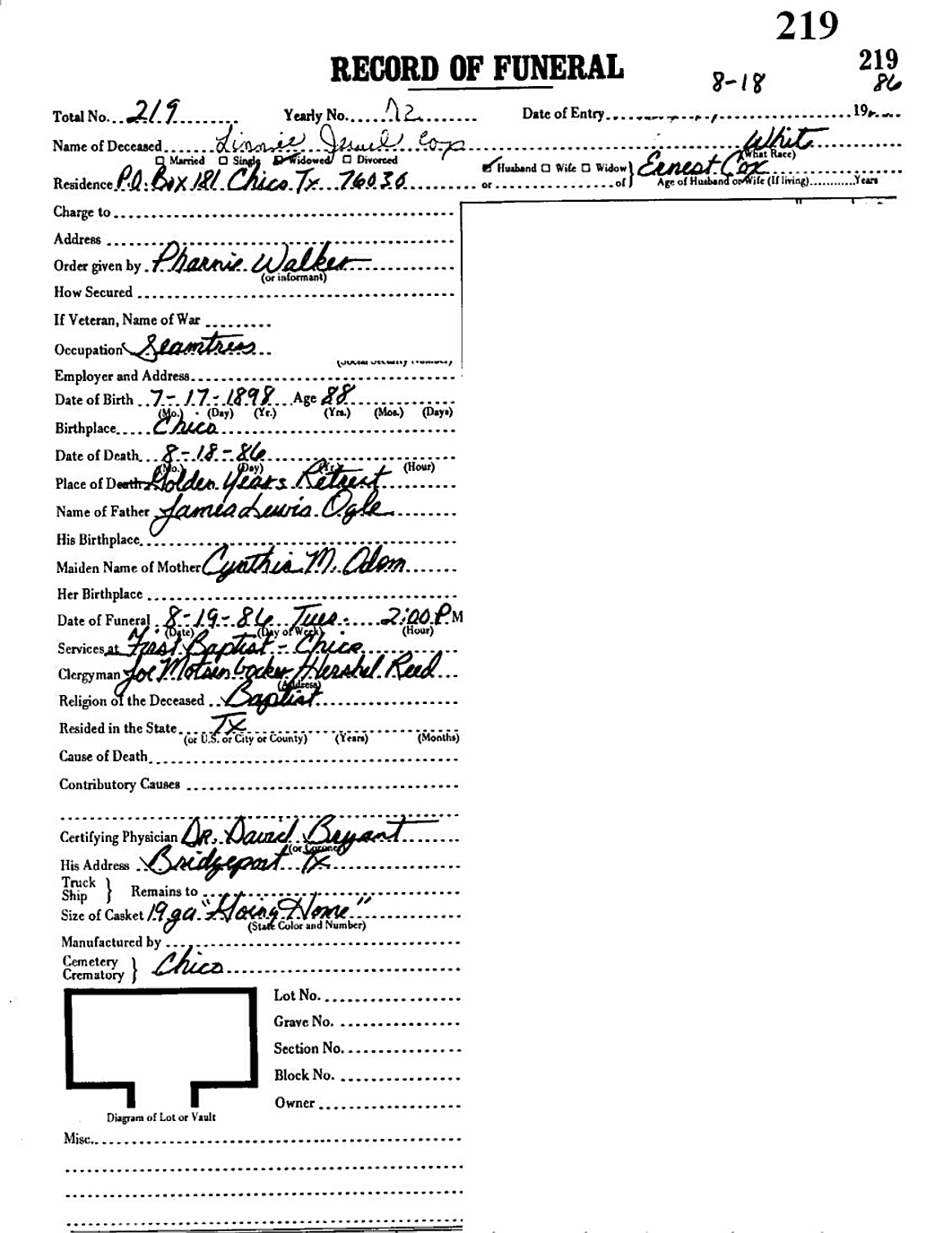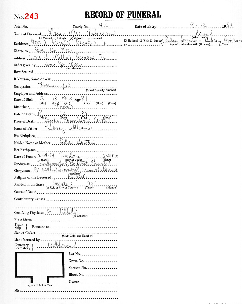 A boy from AR, Killed on railroad Christian Funeral Home C22/C22-254.jpg Aaron, James Thomas Christian Funeral Home C31/C31-110.jpg Abbott, Julia Gage Christian Funeral Home C31/C31-123.jpg Abbott, Lewis Elmer Coker Funeral Home C56/C56-091.jpg Abbott, T. Aleck Christian Funeral Home C35/C35-273.jpg Abbs, James Russell Christian Funeral Home C01/C01-110.jpg Abel, Anto A., Boyd Funeral Home B88/B88-135.jpg Abel, Arlyce Astor, Boyd Funeral File Sheet BF81/BF81-141.jpg Abel, Evelyn Myra Muse, Boyd Funeral File Sheet BF95/BF95-001.jpg Abel, Helen Elizabeth Miller, Boyd Funeral File Sheet BF91/BF91-006.jpg Abel, Helen Miller, Boyd Funeral Home B88/B88-125.jpg Abel, Nancy Jean Prince Coker Funeral Home C64/C64-076.jpg Abel, Walter V. Christian Funeral Home C22/C22-162.jpg Abernathy , Mary Ruth Cook Christian Funeral Home C86/C86-137.jpg Abernathy, Baby of Bill & Edna Earl, Hawkins Funeral Home H63/H63-110.jpg Abernathy, Ella Dora Jackson Christian Funeral Home C39/C39-261.jpg Abernathy, L.D., Mr. Christian Funeral Home C22/C22-269.jpg Abernathy, William Glenn, Hawkins Funeral File Sheet HF87/HF87-107.jpg Abernathy, William Glenn, Hawkins Funeral Home H84/H84-282.jpg Able, Barbara Elizabeth "Betty" Morris Coker Funeral Home C64/C64-215.jpg Able, Carrol Floyd "Crick", Hawkins Funeral File Sheet HF00/HF00-001.jpg Able, Forest Lee Christian Funeral Home C50/C50-017.jpg Able, Thomas Franklin Coker Funeral Home C56/C56-148.jpg Able, William Morgan Coker Funeral Home C56/C56-264a.jpg Able, William Morgan Coker Funeral Home C56/C56-264.jpg Absher, Donald Marion Christian Funeral Home C01/C01-182.jpg Absher, Opal Lee Kaker Hunter, Hawkins Funeral File Sheet HF01/HF01-001.jpg Absher, Ulyses Sherman Christian Funeral Home C31/C31-201.jpg Absher, William P. "Bill", Hawkins Funeral File Sheet HF93/HF93-001.jpg Absher, William P., Hawkins Funeral Home H93/H93-088.jpg Acker, Mary Elizabeth Christian Funeral Home C15/C15-102.jpg Acker, William H., Dr. Christian Funeral Home C22/C22-084.jpg Acola, Marian Elizabeth Woody Christian Funeral Home C98/C98-299.jpg Acola, Sam Christian Funeral Home C80/C80-104.jpg Acola, Sam, Hawkins/Christian Funeral Home HCD80/HCD80-003.jpg Action, Bonnie Lynn Bowser, Hawkins Funeral File Sheet HF73/HF73-0001.jpg Acton, Bonnie Lynn Bauser, Hawkins Funeral Home H80/H80-028.jpg Adair, Betty Darline Christian Funeral Home C45/C45-102.jpg Adair, Carl Sine Christian Funeral Home C45/C45-102.jpg Adair, Ester, Hawkins Funeral File Sheet HF73/HF73-0002.jpg Adama, Randy Dale, Jr., Hawkins Funeral Home H90/H90-110.jpg Adams, Acie Dee Christian Funeral Home C76/C76-098.jpg Adams, Alonzo Bright, Hawkins Funeral Home H61/H61-044.jpg Adams, Audrey, Boyd Funeral Home B88/B88-165.jpg Adams, Barry Carroll, Hawkins Funeral File Sheet HF85/HF85-043.jpg Adams, Beulah Etta Pitts, Hawkins Funeral File Sheet HF73/HF73-0004.jpg Adams, Billy Carroll, Hawkins Funeral Home H84/H84-189.jpg Adams, Carl Victor, Hawkins Funeral Home H68/H68-061.jpg Adams, Ceffie Daisy Craighead Christian Funeral Home C45/C45-155.jpg Adams, Charles Norris, Boyd Funeral File Sheet BF98/BF98-064.jpg Adams, Charlie Bruce Christian Funeral Home C59/C59-090.jpg Adams, Corinne P. Peterson Christian Funeral Home C01/C01-193.jpg Adams, Danny Charles, Boyd Funeral File Sheet BF95/BF95-135.jpg Adams, Dewey Avon, Hawkins Funeral File Sheet HF73/HF73-0003.jpg Adams, Edgar Ross, Hawkins Funeral Home H57/H57-039.jpg Adams, Elmer Justice, Hawkins Funeral Home H66/H66-210.jpg Adams, Eula C. Ingle, Hawkins Funeral Home H69/H69-131.jpg Adams, Garland Wayne, Hawkins Funeral File Sheet HF89/HF89-002.jpg Adams, Garland Wayne, Hawkins Funeral Home H88/H88-126.jpg Adams, George Martain Christian Funeral Home C49/C49-028.jpg Adams, Jerry Dean Christian Funeral Home C73/C73-206.jpg Adams, John Christian Funeral Home C35/C35-289.jpg Adams, John Henry, Hawkins Funeral File Sheet HF01/HF01-002.jpg Adams, John Louis, Hawkins Funeral Home H55/H55-147.jpg Adams, Josie Jones Churchhill Christian Funeral Home C91/C91-116.jpg Adams, Kenney Milton "Ragmop", Boyd Funeral File Sheet BF81/BF81-015.jpg Adams, Laura Sue Coker Funeral Home C27/C27-008.jpg Adams, Leatrice Isabell Moler, Hawkins Funeral File Sheet HF99/HF99-001.jpg Adams, Lera "Gerry" Burnette Woltz, Hawkins Funeral File Sheet HF98/HF98-001.jpg Adams, Leroy Franklin Christian Funeral Home C93/C93-076.jpg Adams, Lillian Josie Christian Funeral Home C73/C73-167.jpg Adams, Margaret Alma Murphy Christian Funeral Home C68/C68-465.jpg Adams, Margaret Iola Parish Christian Funeral Home C95/C95-146.jpg Adams, Marina Helen Young, Hawkins Funeral Home H69/H69-005.jpg Adams, Martha Ann Malone Christian Funeral Home C42/C42-076.jpg Adams, Mary Elizabeth "Betty"(Karen), Hawkins Funeral Home H53/H53-107.jpg Adams, Mary Ferguson Dill, Hawkins Funeral Home H60/H60-031.jpg Adams, Milton Elmore Christian Funeral Home C39/C39-106.jpg Adams, Myrtle Floyd Harris, Hawkins Funeral File Sheet HF01/HF01-003.jpg Adams, Newell Wayne "Bill" Dec 10, 1980 Mrs. Adams Pleasant Grove #1 CL80/CL80-38 Adams, Oma Nov 23, 1981 Bud Adams & Jessie Ragsdale Sweetwater CL80/CL80-107 Adams, Randy Dale, Jr., Hawkins Funeral File Sheet HF91/HF91-001.jpg Adams, Robert Esco, Hawkins Funeral File Sheet HF73/HF73-0005.jpg Adams, Robert Louis, Hawkins Funeral Home H57/H57-171.jpg Adams, Ronald Floyd Christian Funeral Home C89/C89-163.jpg Adams, Sarah F. Christian Funeral Home C45/C45-259.jpg Adams, W., Hawkins Funeral Home H23/H23-148.jpg Adams, William Rosco "Bud" Christian Funeral Home C88/C88-185.jpg Adams, William Walter, Hawkins Funeral Home H61/H61-145.jpg Addington, Jimmy Ray Christian Funeral Home C88/C88-260.jpg Adkins, Lonnie Roe Christian Funeral Home C93/C93-012.jpg Adkins, Paul William, Hawkins Funeral Home H33/H33-091.jpg Adkins, Peggy Mildred Thomas Christian Funeral Home C86/C86-283.jpg Admire, Clarence Holt, Hawkins Funeral Home H57/H57-114.jpg Admire, Willie Audrey King, Hawkins Funeral Home H55/H55-151.jpg Aerni, Lucile Flowers, Hawki