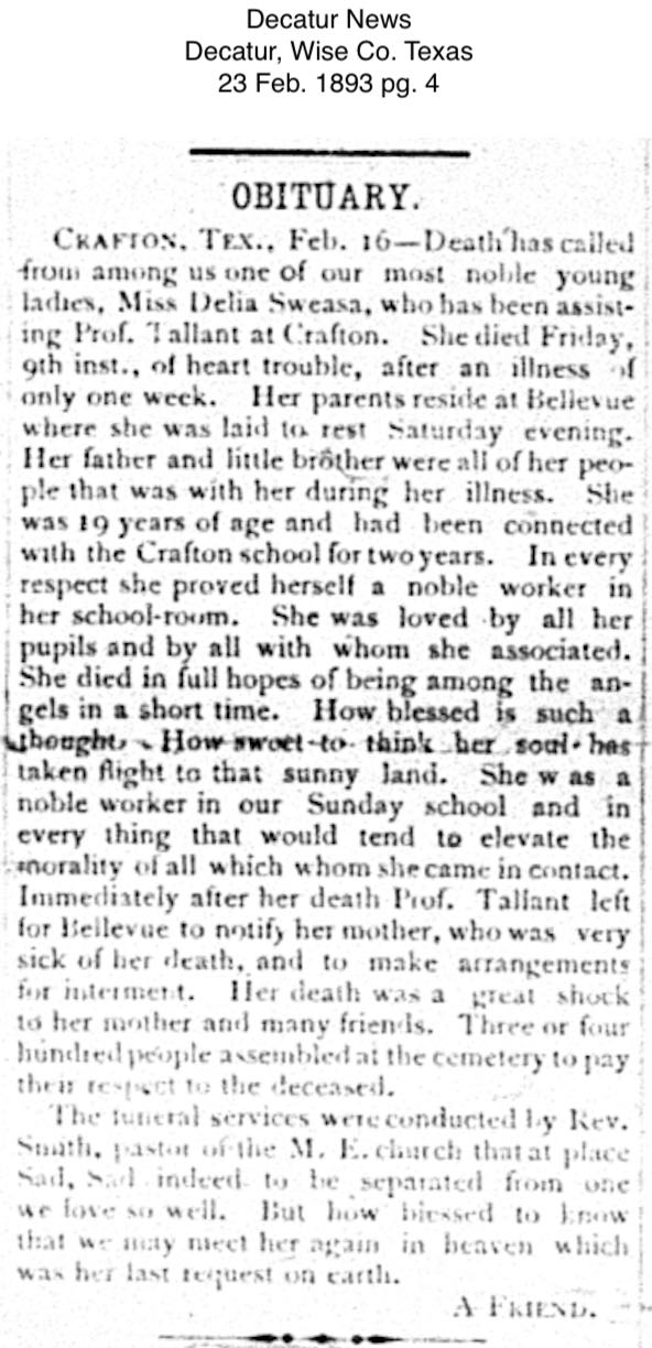 Swezea, Delia - 1893 -- Various Older Newspapers