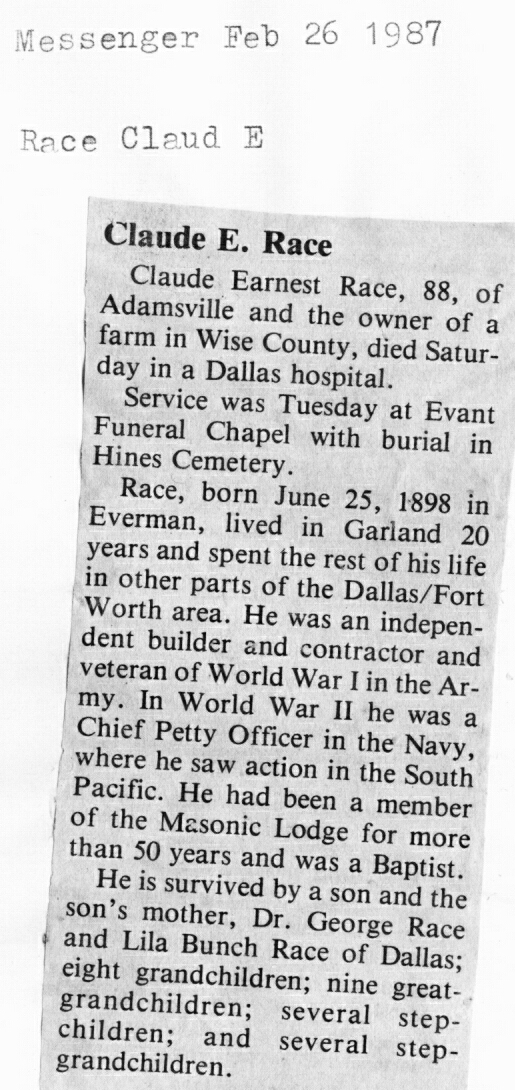 Race, Claude Earnest 1987 -- Newspaper Clipping